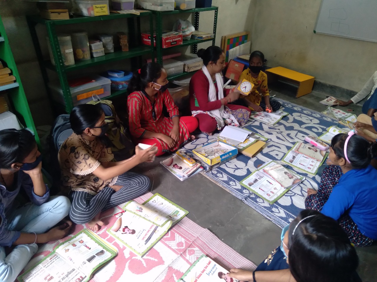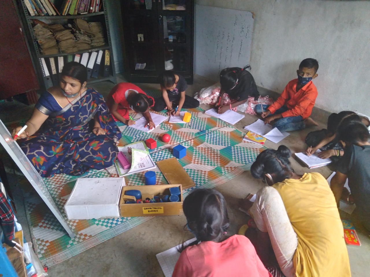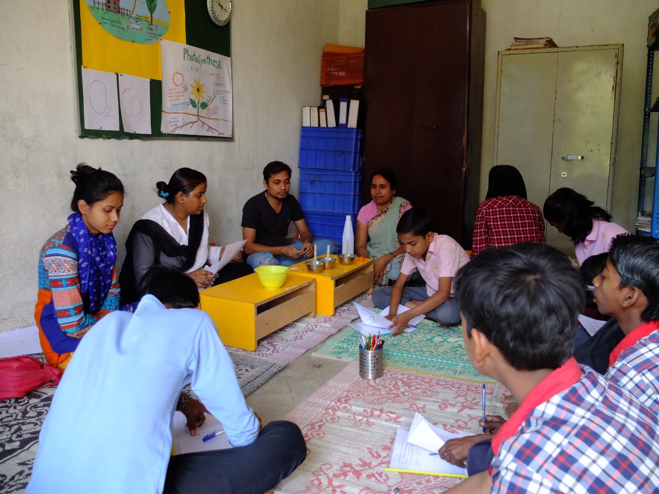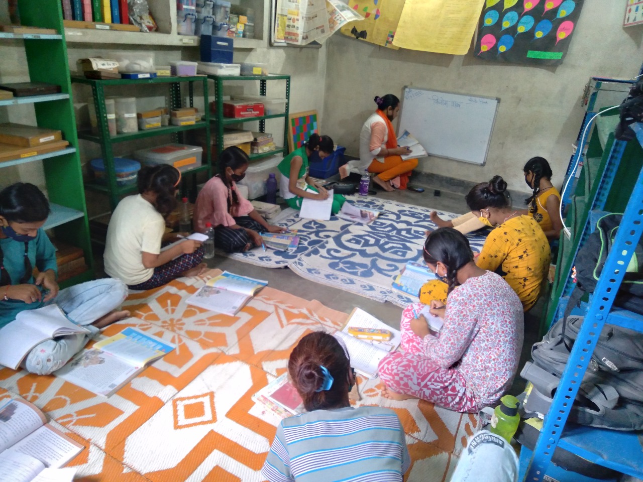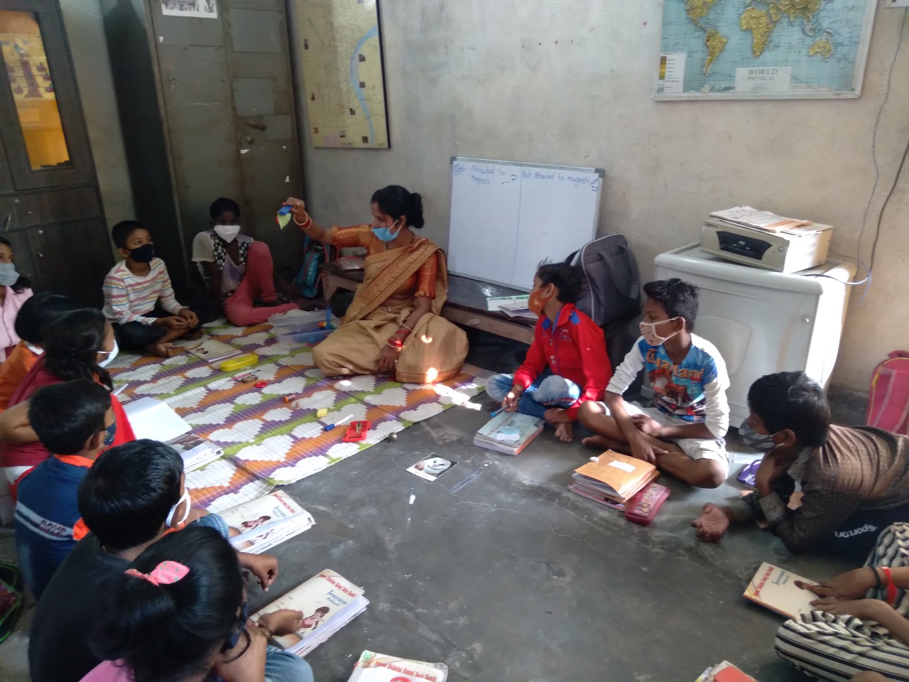 Science Experiment (Practical learning) Learning is easier when it is practical in life and more when kids are engaged. Our children feel much neglected because of the background they come from, so in Jeevan Siksha School teachers and students sit down on the ground on the mats together for both learning and eating so that they feel equal.